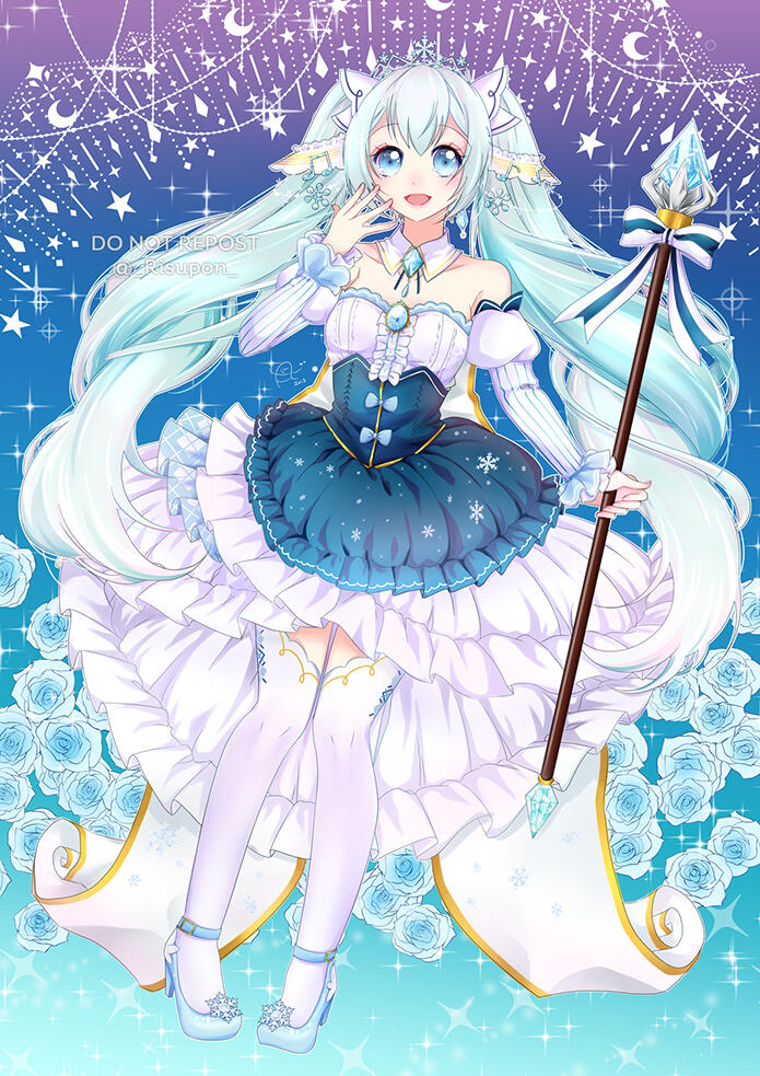 Snow Miku 2019Digital art piece for a group project of my art circle 'Momoiro Syndrome'. The illustration was printed as a bromide for an idol-themed rally at Dokomi 2019. Outlines were used for a colouring book project.The full-body drawing has been used to produce acrylic standees as merchandise as well.