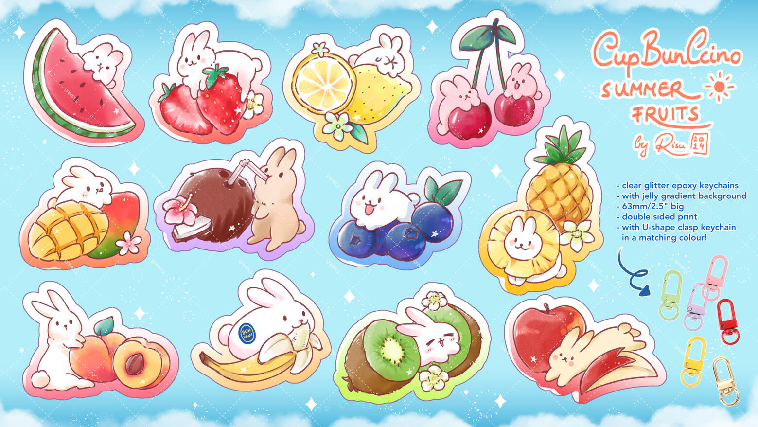Original Art: CupBunCcino Summer Fruits SeriesThird merchandise series of my original 'CupBunCcino' lineThis time the theme is fruits that come in all colours while bunnies interact with them in their own way.