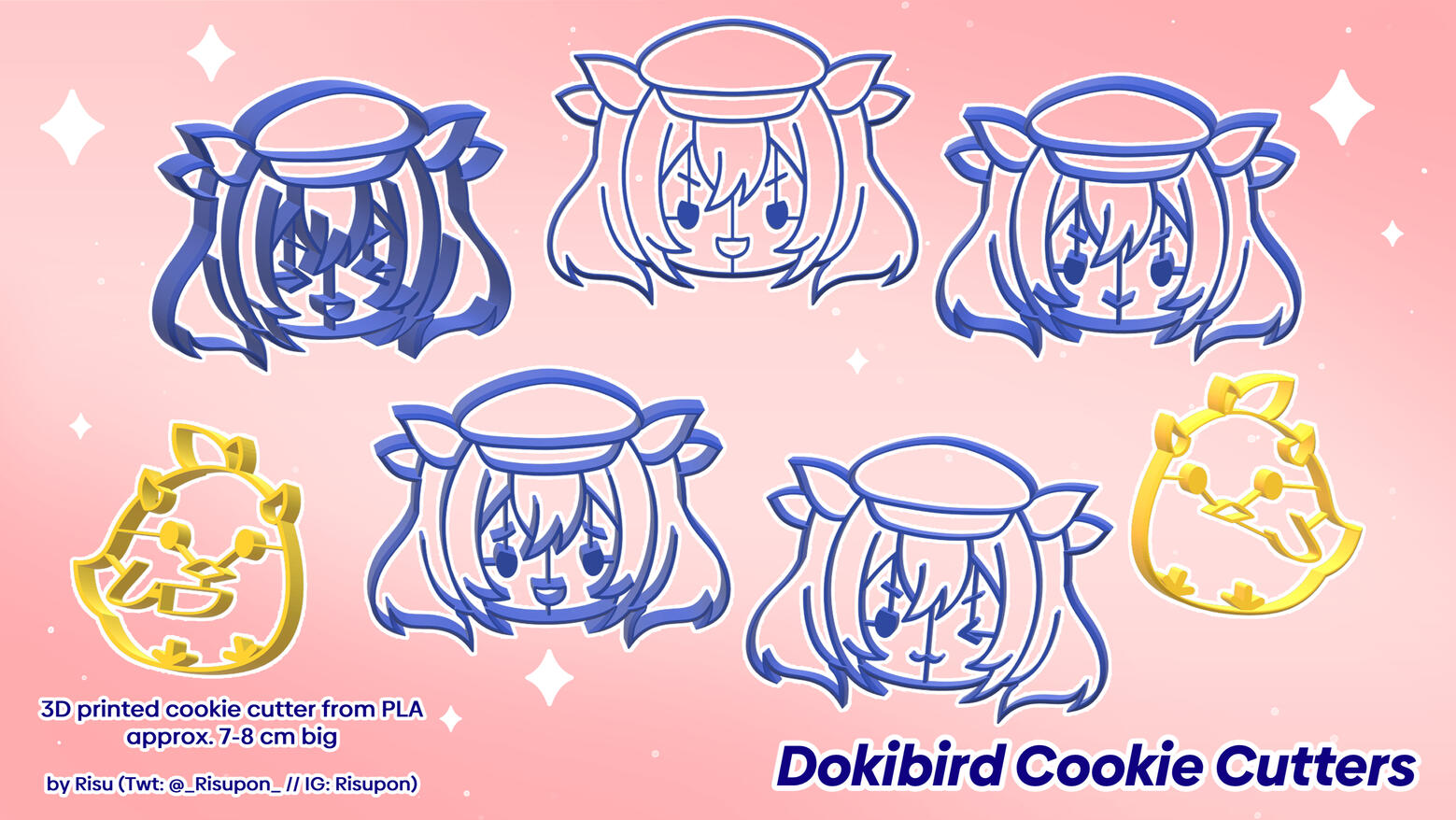 Cookie Cutter Designs for Dokibird's Charity Auction [Vtuber]Part of a Commissioned work under Dokibird's and her teams supervisionIncludes 5 different Dokibird design and 2 mascot designsEach winner of one of the five Dokibird designs got a matching mascot with the expression of their choice, making the bidding item a set of 2 cookie cutters each
