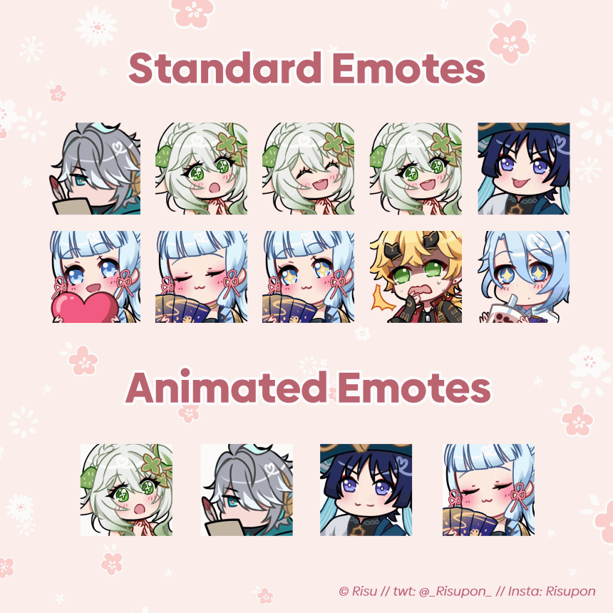 You will receive exports in corresponding sizes, for example: 112 x 112, 56 x 56, 28 x 28 pixels for Twitch.Standard EmotesSingle Emote - 25€