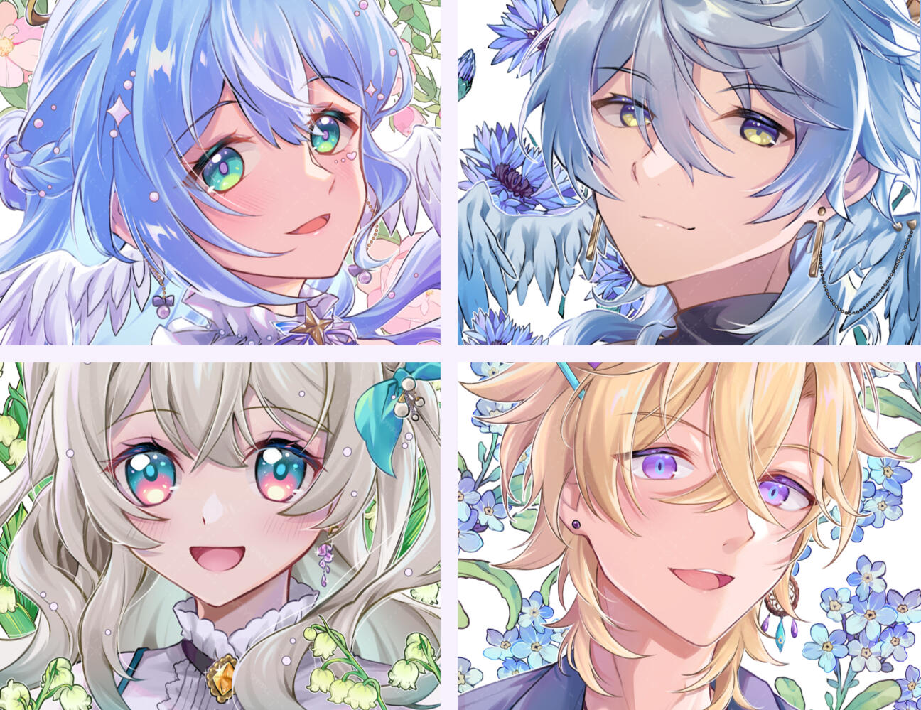Flower Series Illustrations [Honkai: Star Rail]Fan made print series of 4 character illustrations featuring a flower matching their personality or history, part of my work as a HoyoCreator